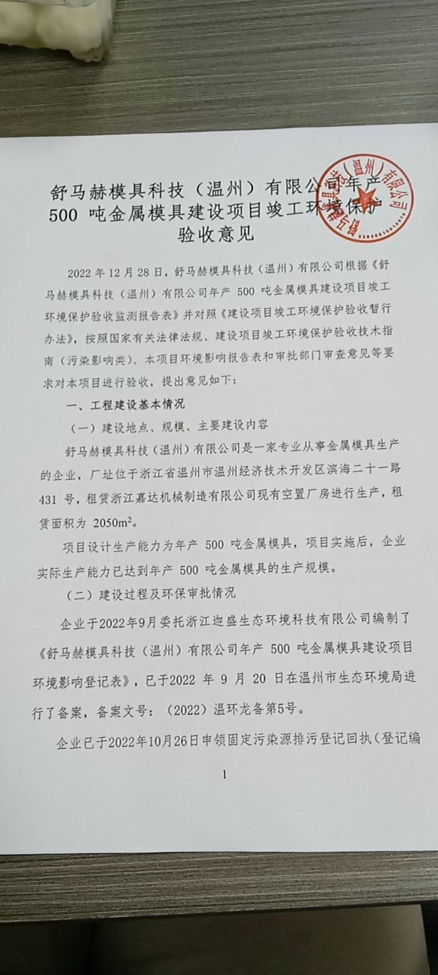 公示内容:舒马赫模具科技(温州)有限公司年产 500 吨金属模具建设项目竣工公示;
