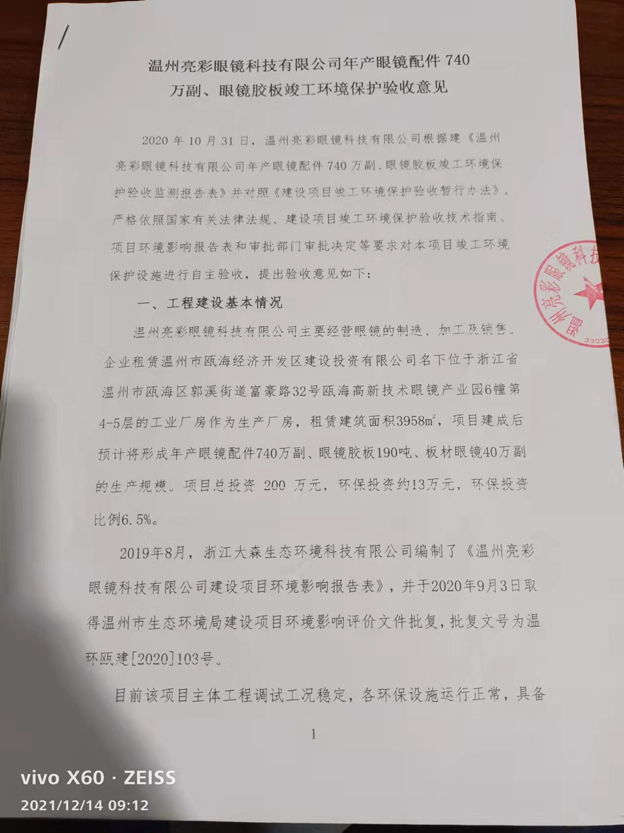 验收公示:温州亮彩眼镜科技有限公司年产眼镜配件740万副、眼镜胶板190吨、板材眼镜40万副建设项目竣工环境保护验收监测报告