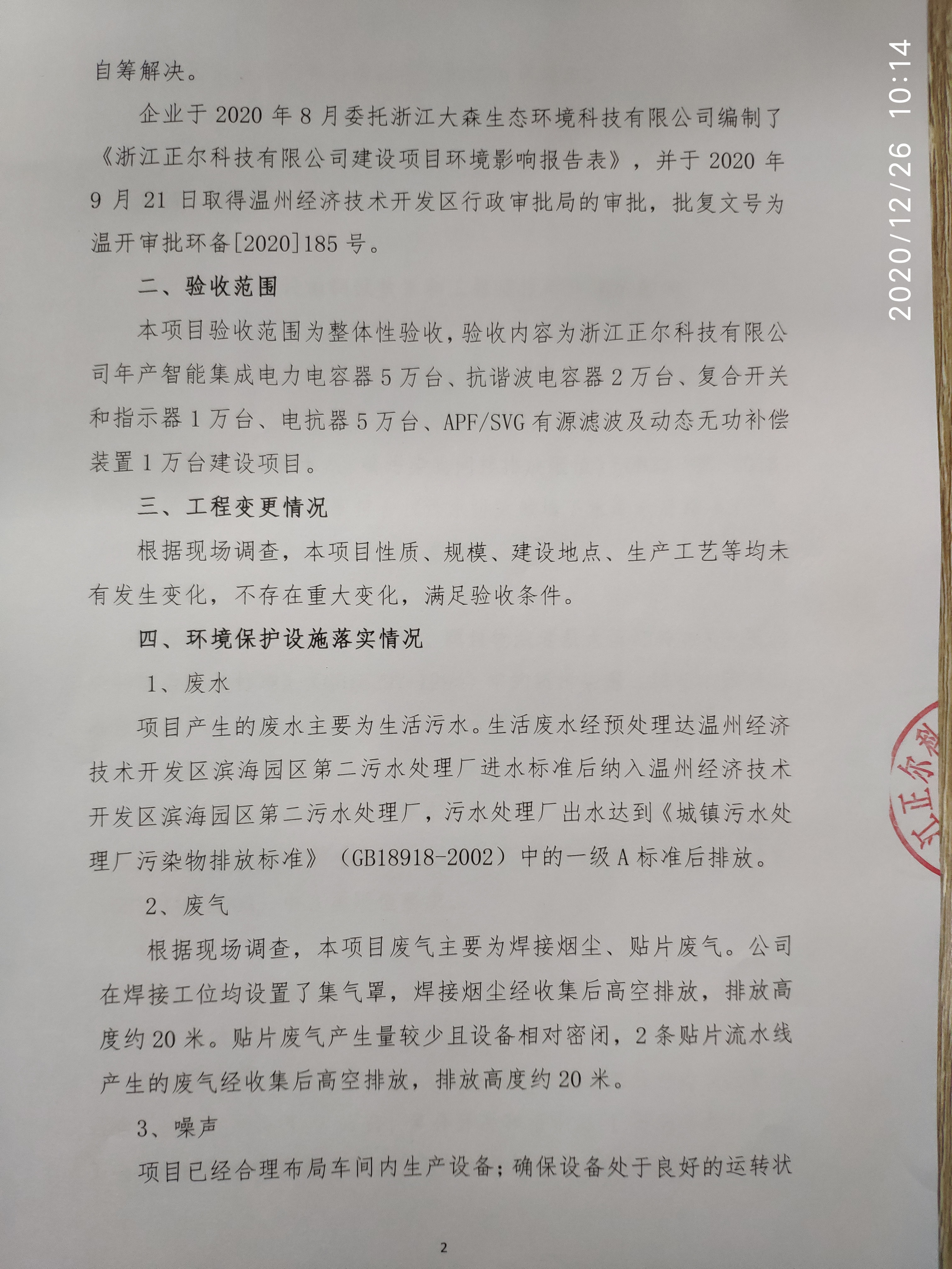 根据《国务院关于修改〈建设项目竣工环境保护管理条例〉的决定》(国务院令第682号),以及环保部《关于发布<建设项目竣工环境保护验收暂行办法>的公告》(国环规环评[2017]4号),现将浙江正尔科技有限公司年产智能集成电力电容器 5 万台、抗谐波电容器 2 万台、复合开关和指示器 1 万台、电抗器 5 万台、APF/SVG有源滤波及动态无功补偿装置 1 万台建设项目竣工环境保护验收监测报告公示如下: