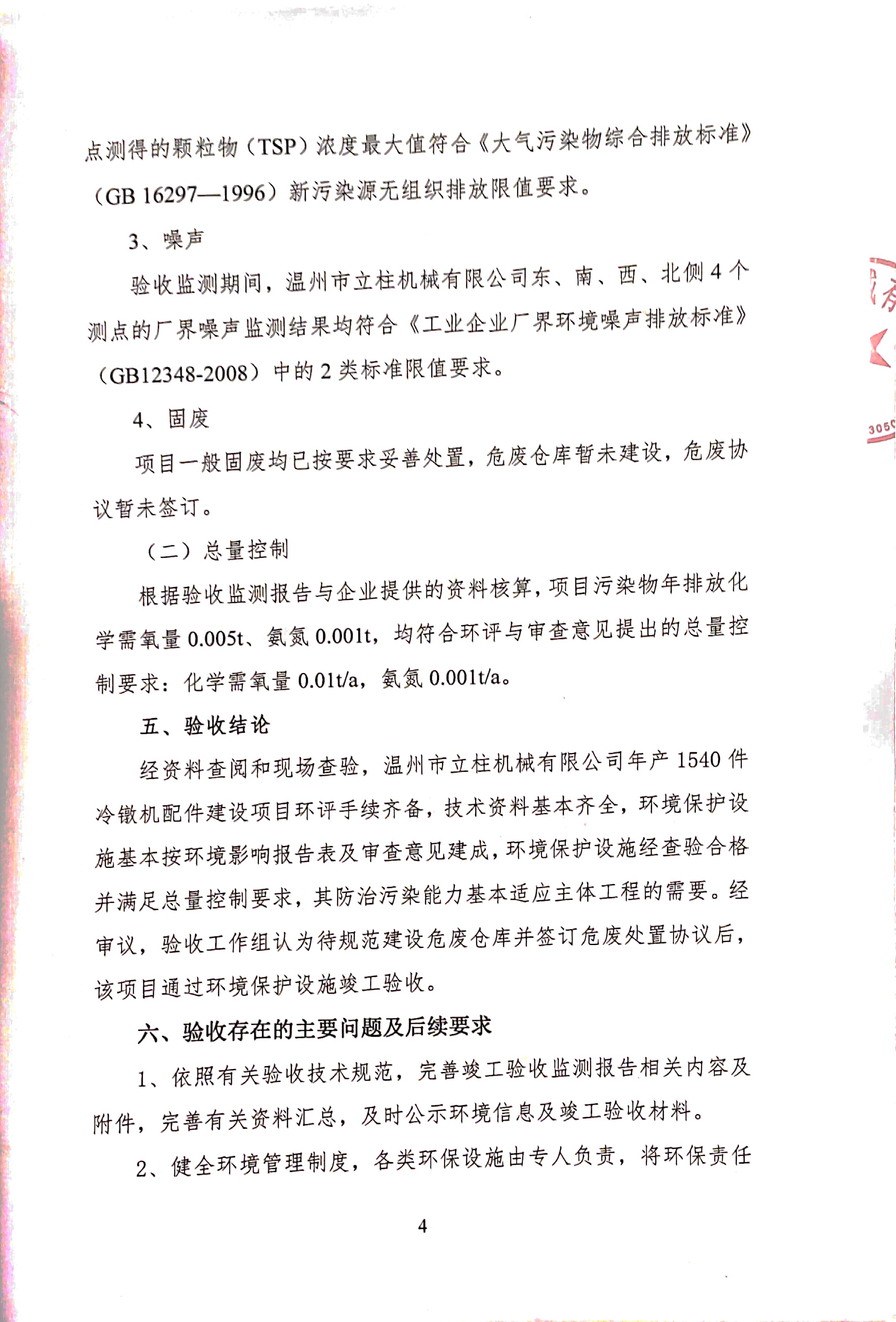 根据《国务院关于修改〈建设项目竣工环境保护管理条例〉的决定》(国务院令第682号),以及环保部《关于发布<建设项目竣工环境保护验收暂行办法>的公告》(国环规环评[2017]4号),现将温州市立柱机械有限公司年产1540件冷镦机配件建设项目竣工环境保护验收监测报告公示如下: