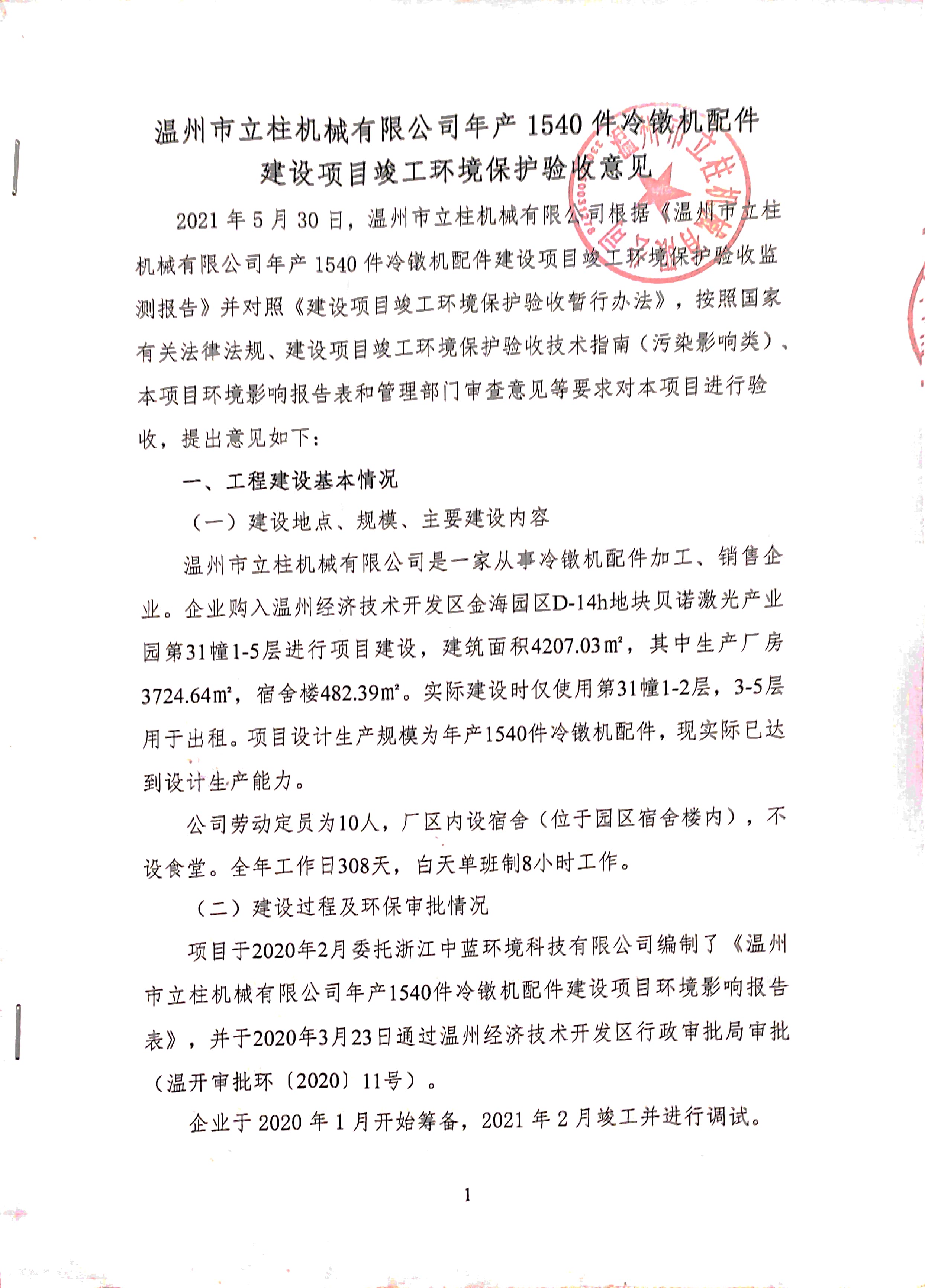 公示内容:温州市立柱机械有限公司年产1540件冷镦机配件建设项目竣工公示;