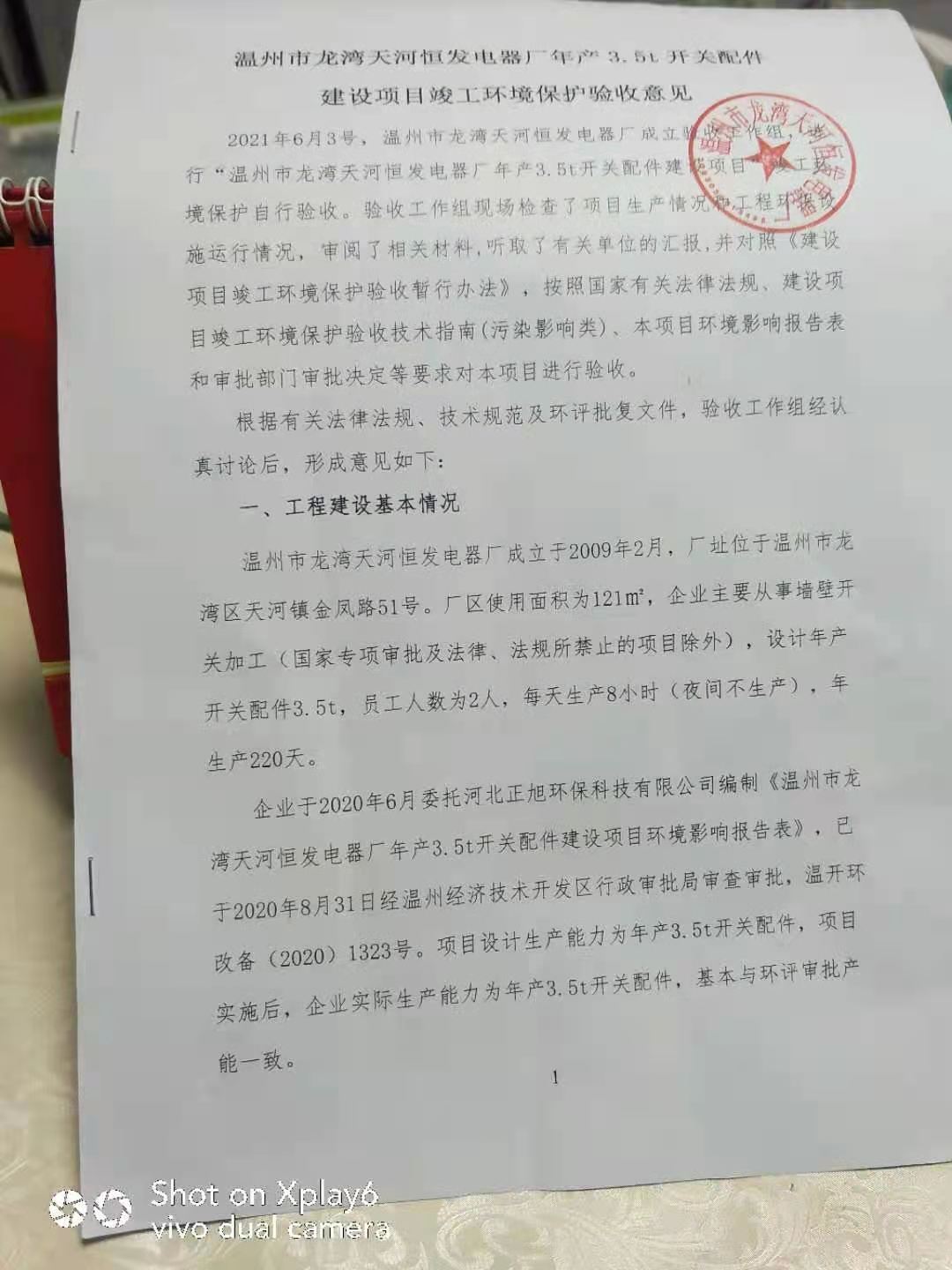 根据《国务院关于修改〈建设项目竣工环境保护管理条例〉的决定》(国务院令第682号),以及环保部《关于发布<建设项目竣工环境保护验收暂行办法>的公告》(国环规环评[2017]4号),现将温州市龙湾天河恒发电器厂年产3.5吨开关配件建设项目竣工环境保护验收监测报告公示如下: