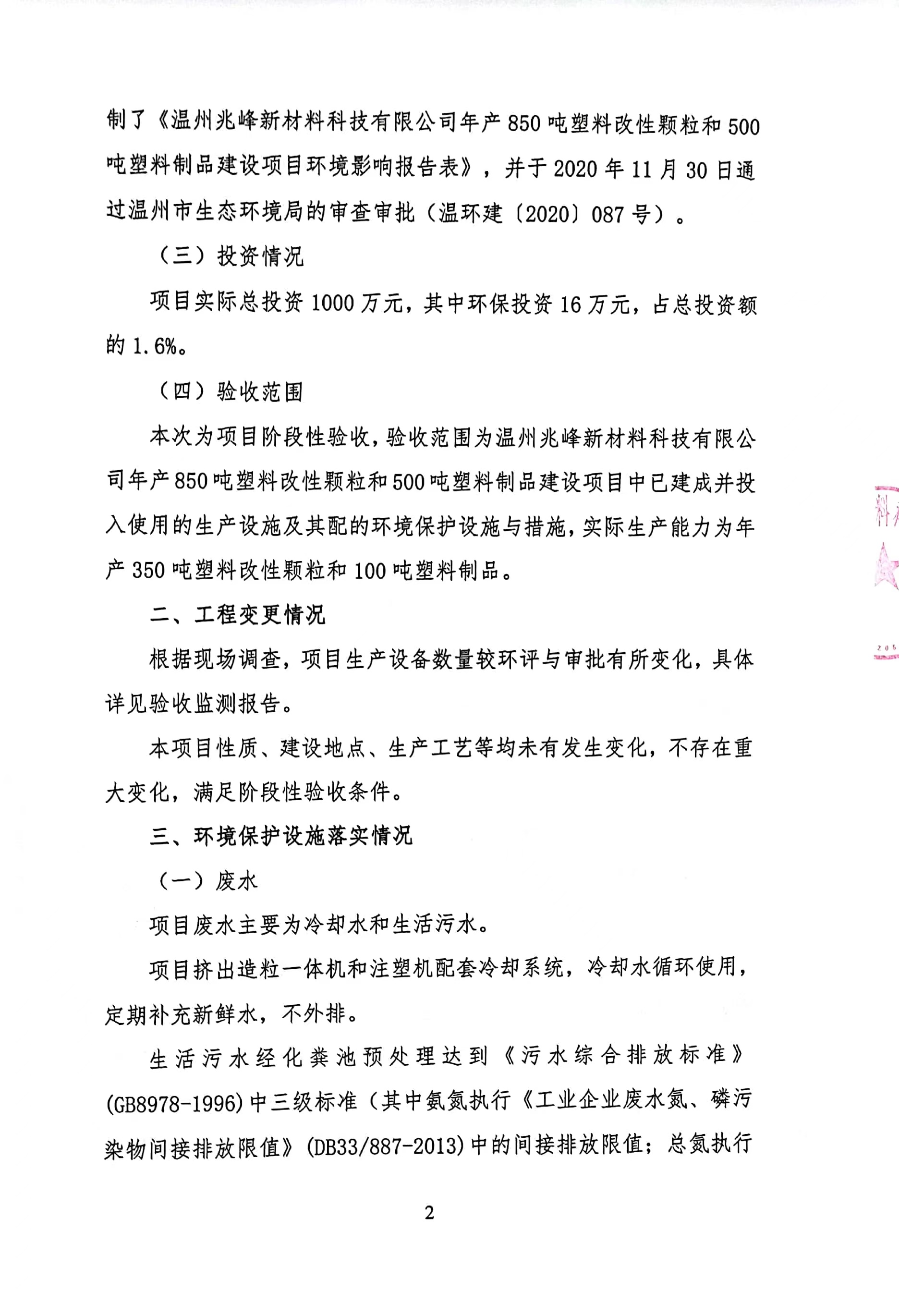 根据《国务院关于修改〈建设项目阶段性竣工环境保护管理条例〉的决定》(国务院令第682号),以及环保部《关于发布<建设项目阶段性竣工环境保护验收暂行办法>的公告》(国环规环评[2017]4号),现将温州兆峰新材料科技有限公司年产850吨塑料改性颗粒和500吨塑料制品项目阶段性竣工环境保护验收监测报告公示如下: