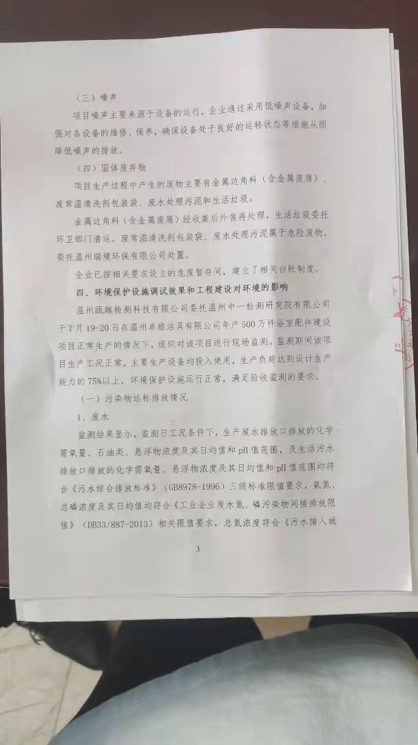 根据《国务院关于修改〈建设项目竣工环境保护管理条例〉的决定》(国务院令第682号),以及环保部《关于发布<建设项目竣工环境保护验收暂行办法>的公告》(国环规环评[2017]4号),现将温州卓雅洁具有限公司年产500万件浴室配件建设项目竣工环境保护验收监测报告公示如下: